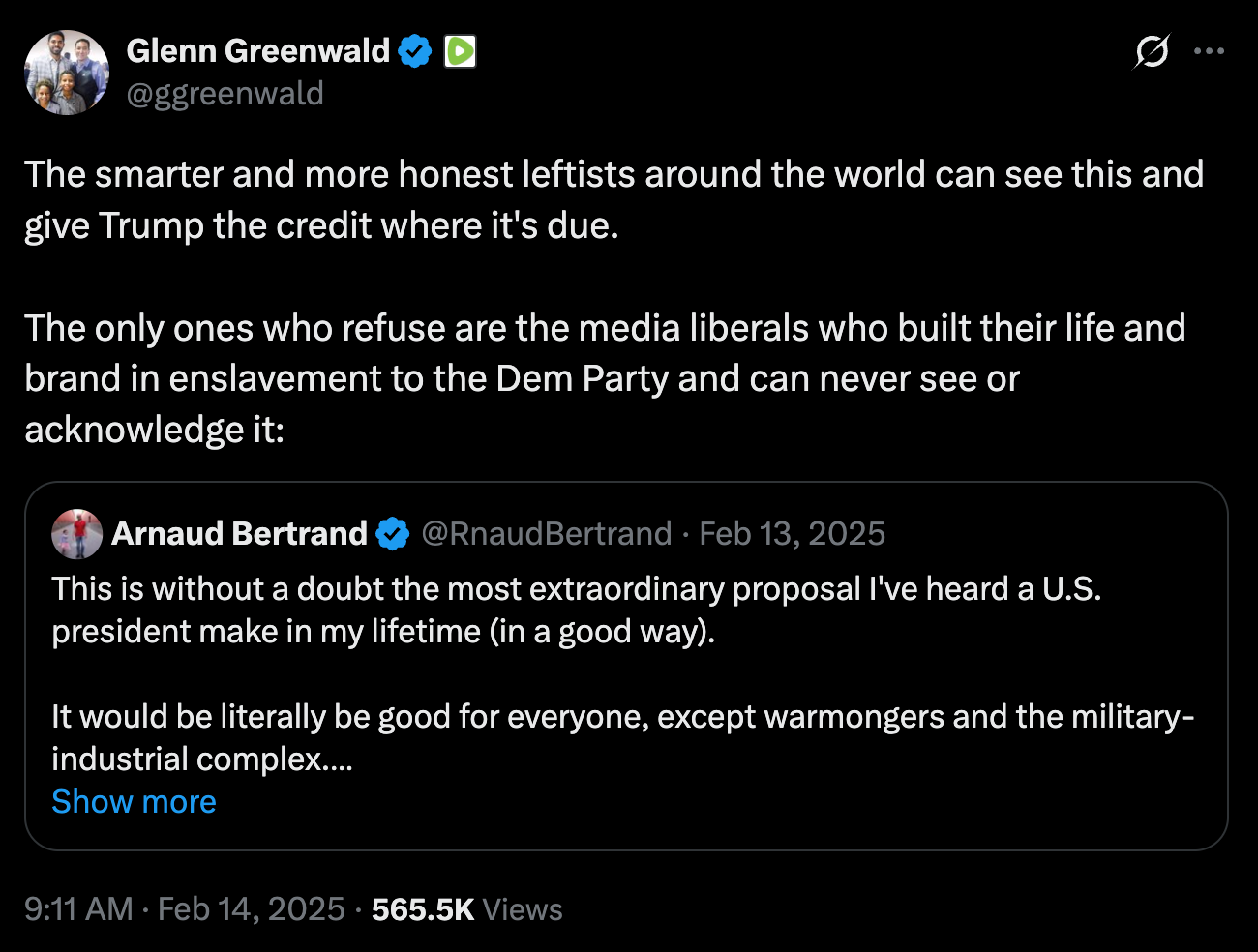Trump’s idle ramblings about cutting the military budget in half in February 2025 led conservative pundit Glenn Greenwald to crow over Trump’s critics on the left as bad faith losers.
