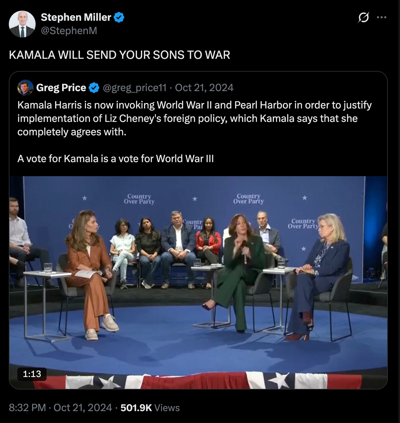 When you’re campaigning with Liz Cheney and endorsing a version of her views—the below from Greg Price is not entirely honest, surprise surprise—you leave yourself open for attacks like this from psychopaths like Stephen Miller.
